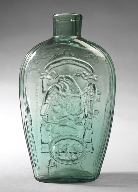 Keene Marlboro Street Glassworks, Keene, New Hampshire, ca. 1820-1830. Glass, blown molded bright medium green color, tooled collared mouth, pontil scar, pint size. GIV-5. Jeffrey TilLou Antiques